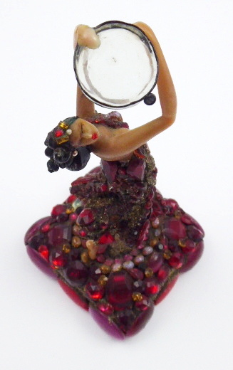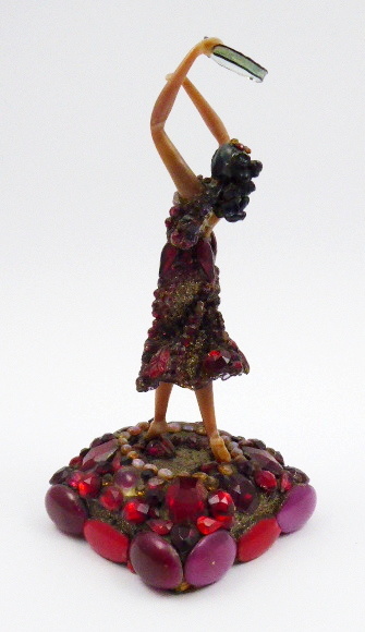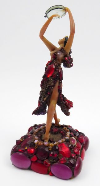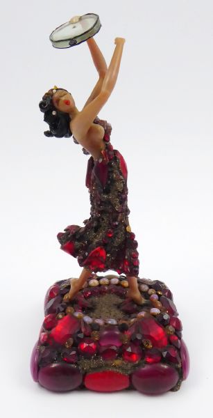 TANEČNICE S BUBÍNKEM - ŽELEZNÝ BROD A JABLONECKO Československo, Železný Brod a Jablonecko, 30. léta minulého století. Autor: světově proslulý sklářský výtvarník Jaroslav Brychta (1895-1971). Sklárny v Železném Brodě a na Jablonecku. Výška 22,5 cm. Vyšší skleněná figura tanečnice s bubínkem z barevného vinutého a modelovaného skla. Zdobnost skleněné plastiky podtrhují bižuterní skleněné kameny stylizované do podoby rubínů, granátů, opálů a citrínů. Jedna část skleněné plastiky kvůli menšímu poškození lepená. Zajímavý dekorativní i sběratelský kousek v podobě ukázky dobového luxusního exportního evropského zboží na americký trh.