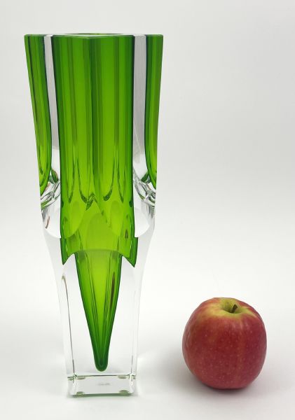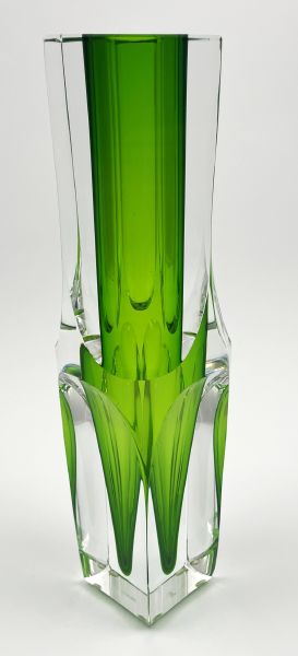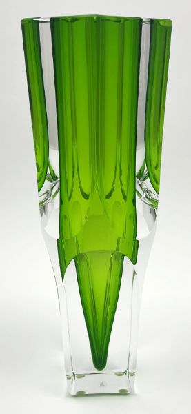 - JAN ČTVRTNÍK, MOSER, Česká republika, Karlovy Vary, kolem roku 2008. Křišťálové a zelené sklo reseda, ručně broušené. Autor modelu: Jan Čtvrtník pro Moser. Výška 31,5 cm. Reprezentativní designová váza ve tvaru hranolu z bezolovnatého křišťálového skla dekorovaná ručně broušenými fazetami s obloukovitým zakončením. Jádro vázy tvoří zelené podjímané sklo reseda. Značeno zespodu: originální leptaná značka firmy Moser.