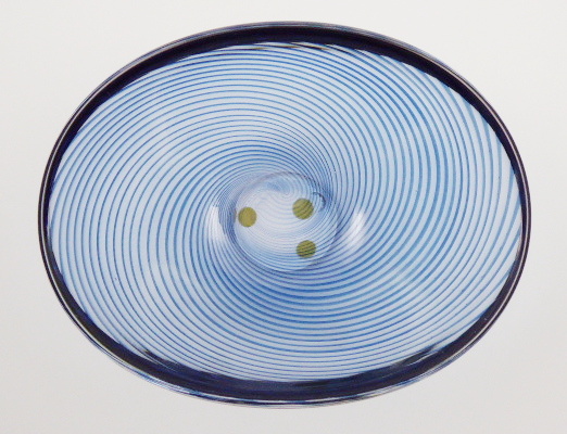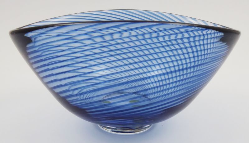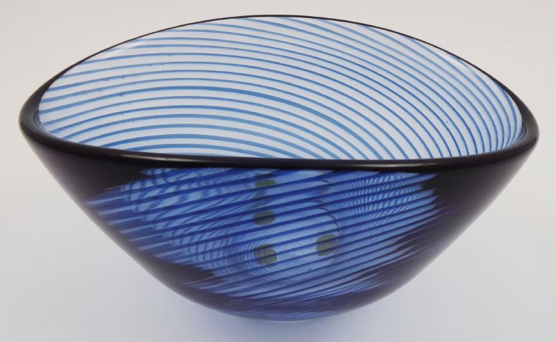 MISKA S MODRÝMI PRUHY - KOSTA BODA, ŠVÉDSKO Švédsko, Kosta Boda, 70. až 80. léta minulého století. Bezbarvé křišťálové sklo, ručně hutně tvarované a ručně broušené. Signováno zespodu: KOSTA, EDENFALK, číslo modelu 58320. Autor: Bengt Edenfalk (1924-2016) pro Sklárnu Kosta Boda. Výška 10 cm, šířka 17 cm a hloubka 10 cm. Umělecká miska organického tvaru s modrými pruhy z modrého skla přejímaného bezbarvým křišťálovým sklem.