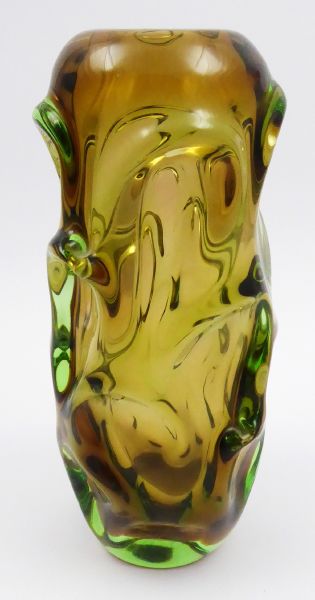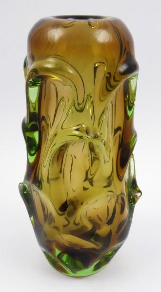 VÁZA Z TOPAZOVÉHO A ZELENÉHO SKLA - ŠKRDLOVICE Československo, Škrdlovice, rok 1959. Hnědé topazové, zelené a bezbarvé sklo, hutně tvarované. Autor modelu: Jan Beránek (nar. 1933) pro Ústředí uměleckých řemesel sklárna Škrdlovice. Datace modelu: rok 1959. Číslo modelu: 5988. Tento model pouze v mírně odlišné barevnosti je publikovaný na stránce 43: Beránek & Škrdlovice Legends of Czech Glass autorů Roberta Bevana Jonese a Jindřicha Paříka vydané v limitované sérii jednoho tisíce kusů nakladatelstvím Mark Hill Publishing. Výška 26 cm. Designová váza z topazového, zeleného a čirého hutně tvarovaného skla vytvářející tzv. Sommerso efekt s výstupky a výčnělky organického tvaru.