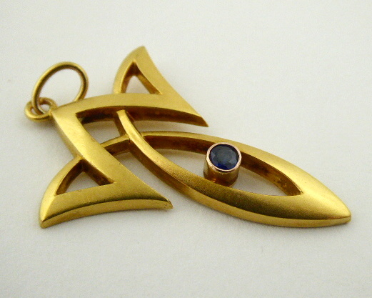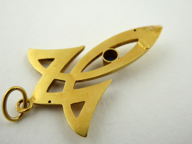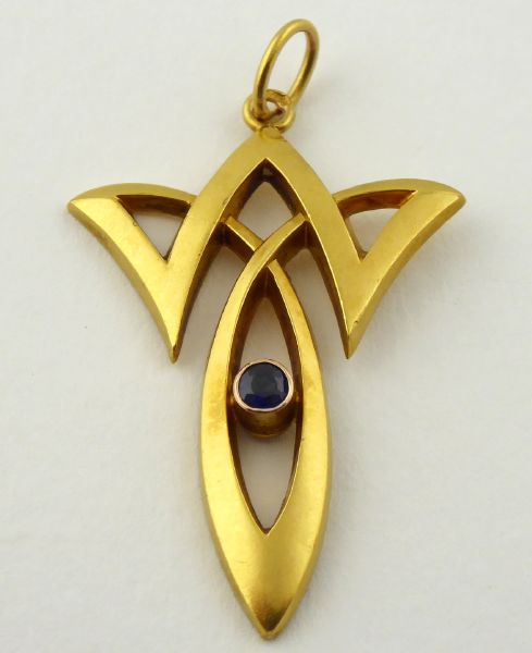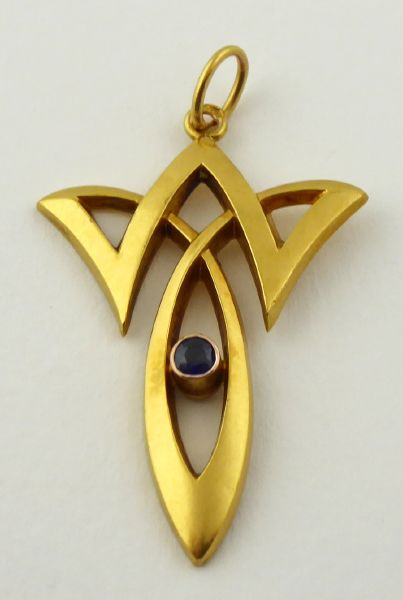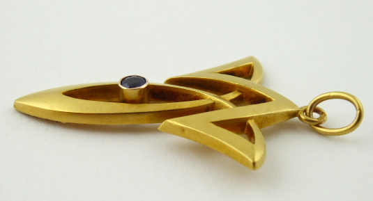 S PŘÍRODNÍM MODRÝM SAFÍREM, Evropa 1901 - 1921. Čtrnáctikarátové zlato, přírodní safír. Období a styl: secese. Ryzost Au 585/1000, celková hmotnost 1,35 g. Celková výška 40 mm, výška bez očka 35 mm. Secesní elegantní přívěsek ze čtrnáctikarátového zlata zdobený přírodním safírem modré barevnosti. Značeno: rakousko-uherský pražský punc pro cizí zboží z období 1902 - 1921 a nezřetelná značka ryzosti 585