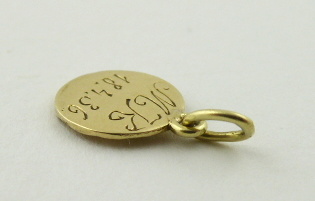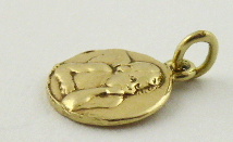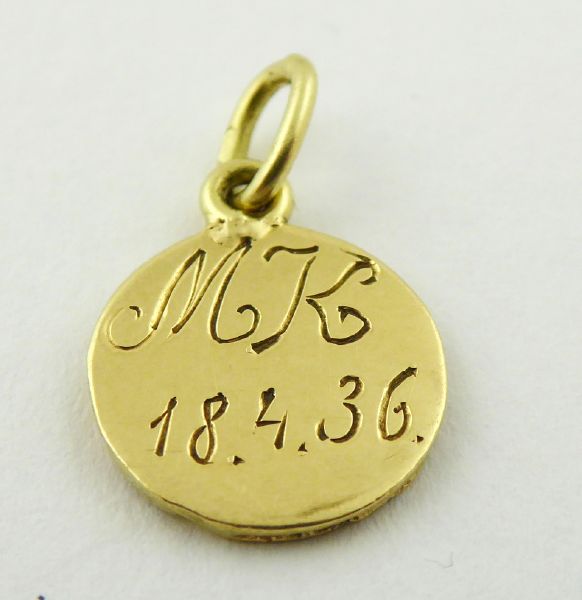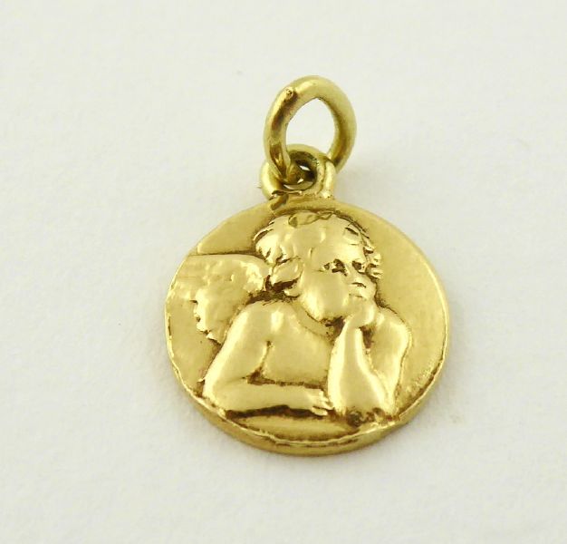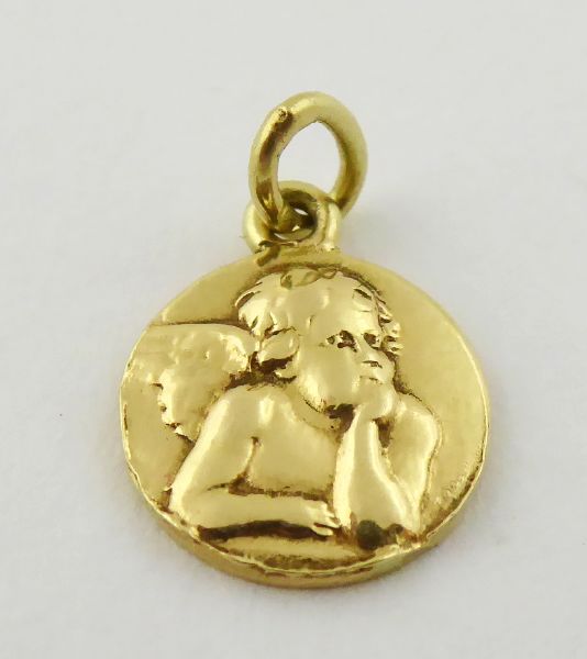 S RELIÉFNÍM ANDÍLKEM PODLE RAFFAELA SANTI Československo, kolem roku 1936. Čtrnáctikarátové zlato. Reliéfní podoba andílka podle předlohy ze světoznámého obrazu Sixtinská madona od italského renesančního malíře Raffaela Santi (1483-1520). Ryzost Au 585/1000, celková hmotnost 1,05 g. Průměr 10 mm, výška s očkem 13 mm. Zlatý přívěsek kulatého tvaru s reliéfní polopostavou andílka. Vzadu gravírované: MK 18.4.36. Značeno: nově označeno platným českým puncem.