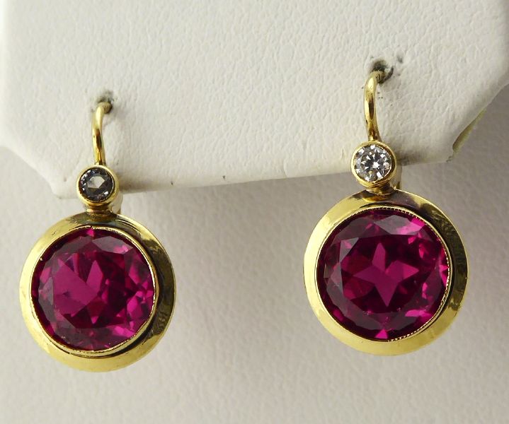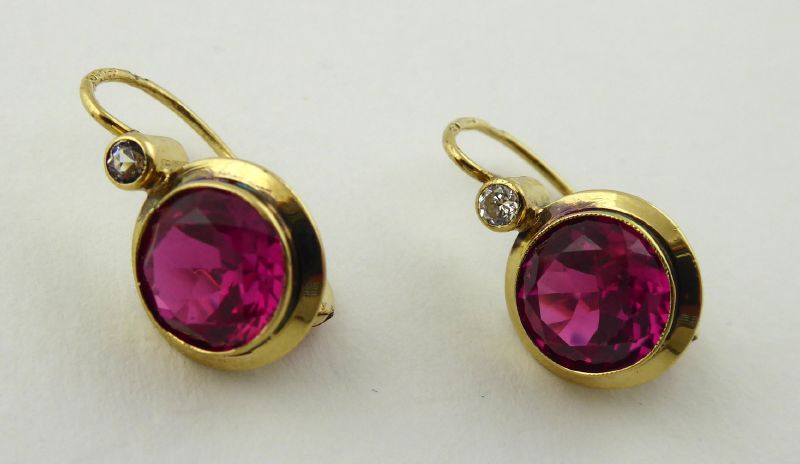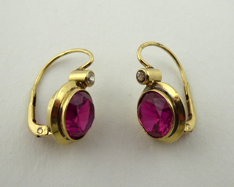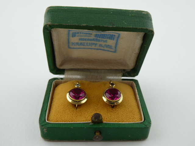 Československo 1929 - 1949. Čtrnáctikarátové zlato, syntetické rubíny, leukosafíry. Ryzost Au 585/1000, celková hmotnost 3,10 g. Délka náušnic 20 mm. Zlaté visací náušnice s výraznými syntetickými rubíny velmi pěkné barevnosti a smíšeného brusu doplněnými malými kulatými leukosafíry. Zapínání na klapku. V originální krabičce se jménem klenotníka z Kralup nad Vltavou. Značeno: nezřetelná mistrovská značka a československý punc lvíček platný pro výše uvedené období.