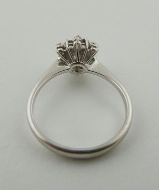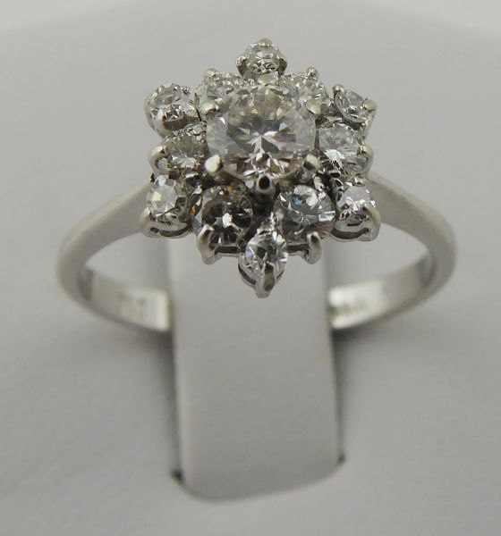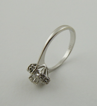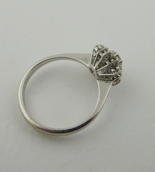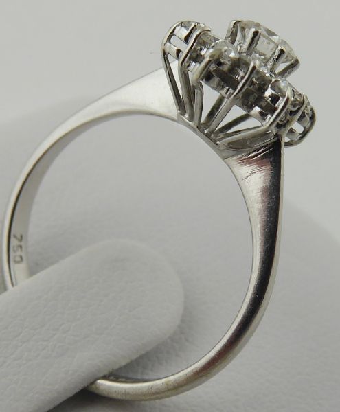 S 13 PŘÍRODNÍMI DIAMANTY, Itálie, Alessandra, třetí třetina minulého století. Bílé osmnáctikarátové zlato, 13 přírodních diamantů. Ryzost Au 750/1000, celková hmotnost 2,80 g. Velikost prstenu 52. Atraktivní prsten z osmnáctikarátového zlata s jedním centrálním přírodním diamantem moderního briliantového brusu o váze 0,25 ct, barvy G a čistoty VS a dvanácti menšími přírodními brilianty moderního brusu o celkové váze 0,35 ct. Velmi kvalitní šperkařská práce. Značeno: československý punc kohout, ryzost 750 a mistrovská značka.