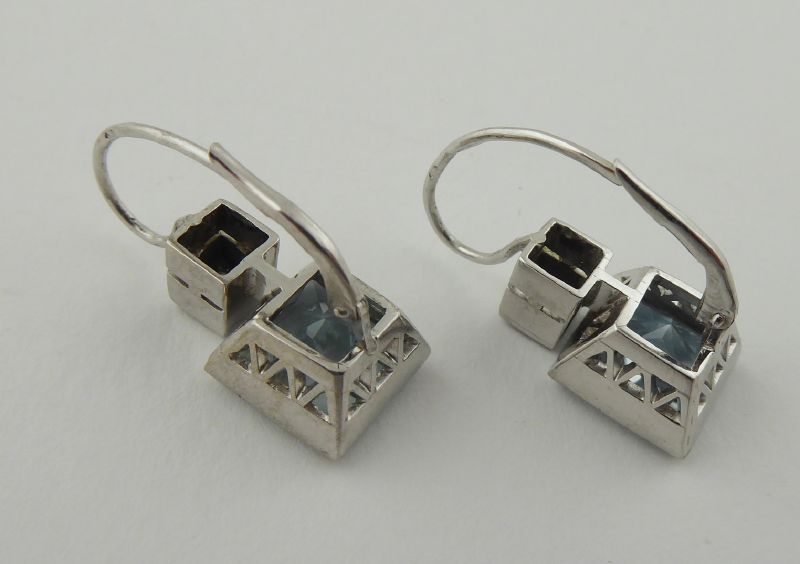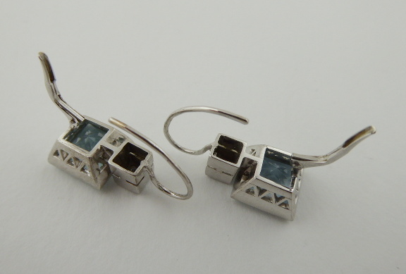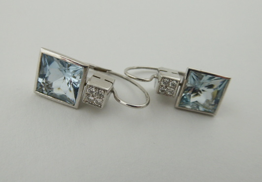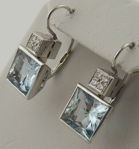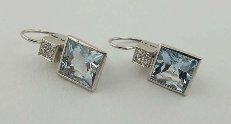 S VELKÝMI PŘÍRODNÍMI AKVAMARÍNY A DIAMANTY, Evropa, poslední čtvrtina minulého století. Bílé osmnáctikarátové zlato, velké přírodní akvamaríny o celkové přibližné váze 6,95 ct a osm přírodních diamantů o celkové váze 0,15 ct, barva G a čistota Si. Ryzost Au 750/1000, celková hmotnost 7,80 g. Délka náušnic 25 mm, šířka 10 mm. Velmi poutavé visací náušnice větších rozměrů z osmnáctikarátového bílého zlata zdobené velkými přírodními ručně broušenými akvamaríny krásné světle modré barevnosti doplněnými o osm přírodních diamantů moderního briliantového brusu. Tyto náušnice atraktivního designu mají zapínání na klapku. Zdařilá klenotnická práce. Značeno: československý punc labuť.