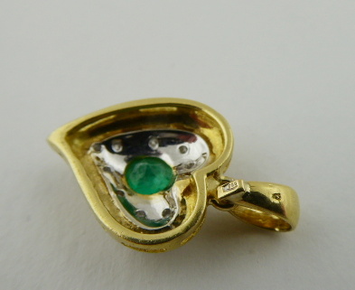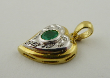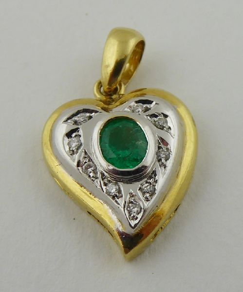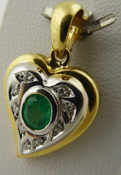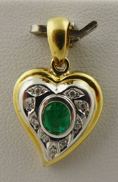 A DIAMANTY, Evropa, přelom 20. a 21. století. Žluté a bílé osmnáctikarátové zlato, přírodní smaragd a 9 přírodních diamantů o celkové váze 0,10 ct, barva G, čistota Si-P. Ryzost Au 750/1000, celková hmotnost 3,69 g. Výška přívěsku 25 mm, šířka 15 mm. Přívěsek v kombinaci bílého a žlutého osmnáctikarátového zlata ve tvaru stylizovaného srdce. Centrální přírodní smaragd pěkně syté jasně zelené barvy, inkludovaný a obklopený devíti malými přírodními brilianty. Značeno: československý punc kohout a ryzost 750.