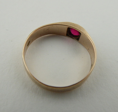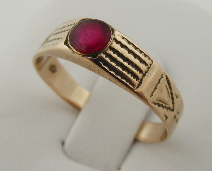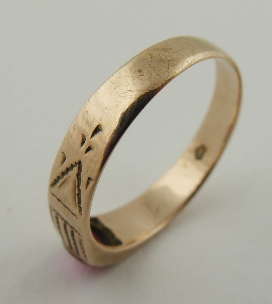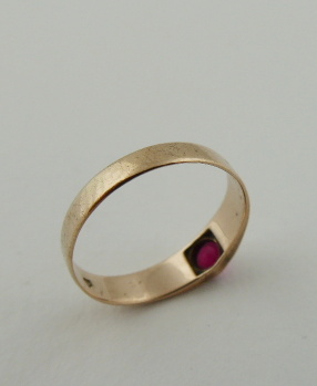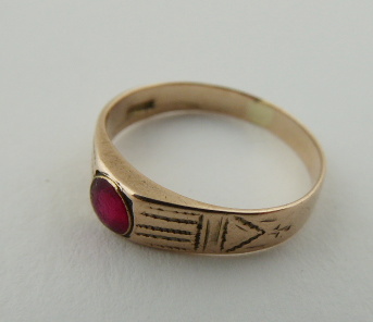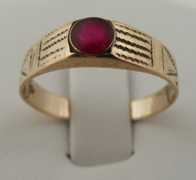 Československo 1930 - 1945. Zlato nízké ryzosti, šestikarátové Au 250/1000, o hmotnosti 1,70 g, červený skleněný kamínek. Veikost prstenu 54 - 55. Prsten ze slitiny se zlatem s jemně gravírovanou obroučkou a centrálním skleněným kamínkem sytě červené barevnosti. Skleněný kamínek nese známky obnošenosti. Značeno: značka výrobce a punc pro podzákonnou ryzost 250.