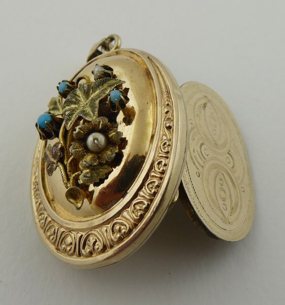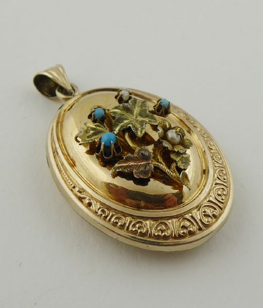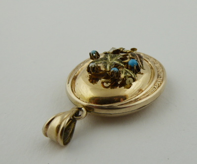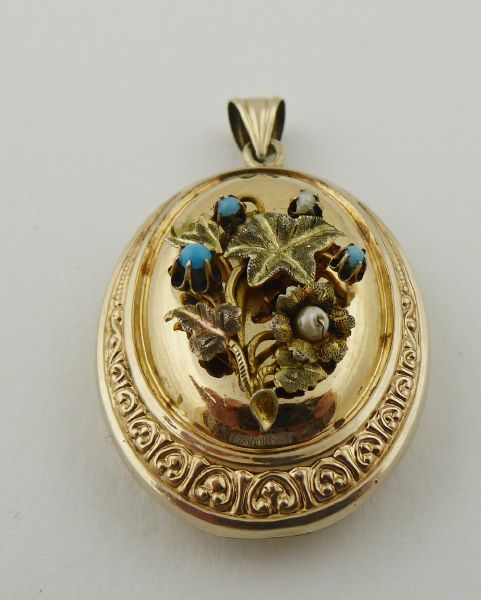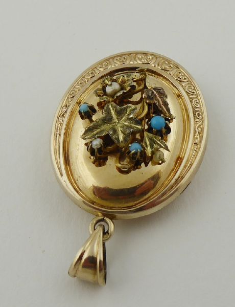 S PERLIČKAMI A TYRKYSY, Střední Evropa 1868 - 1890. Zlacené stříbro, přírodní říční perličky a skleněné tyrkysy. Ryzost Ag 800/1000, celková hmotnost 7,05 g. Výška medailonu bez očka 40 mm, celková výška s očkem 45 mm. Zlacený stříbrný otevírací medailon zdobený reliéfní stylizovanou kyticí s vrcholy tvořenými říčními perličkami a skleněnými kousky napodobujícími tyrkysy. Po obvodu medailonu reliéfní ornament antemionu a na zadní straně gilošování. Uvnitř místo na předmět osobní vzpomínky. Značeno: rakousko-uherský punc pro cizí zboží z období 1868 - 1901.