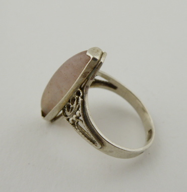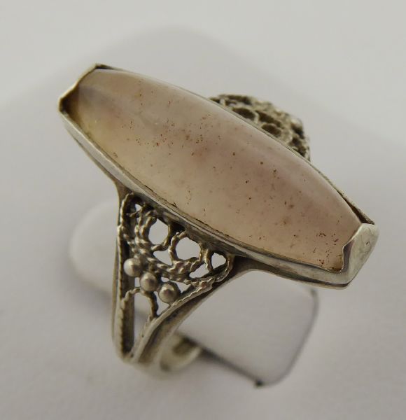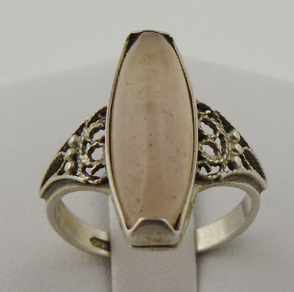 Sovětský Svaz, Sverdlovsk, 70. léta minulého století. Stříbro, přírodní růženín. Ryzost Ag 750/1000, celková hmotnost 3,20 g. Velikost prstenu 55 - 56. Prsten s výrazným centrálním přírodním růženínem, po stranách zdobený jemnou technikou filigránu. Značeno: sovětský punc, značka výrobce a československý punc zajíc.
