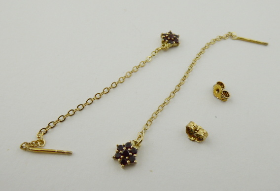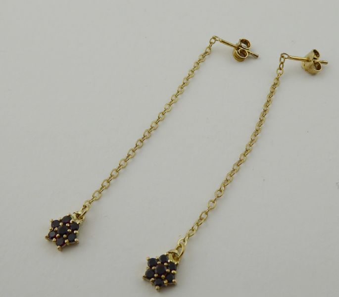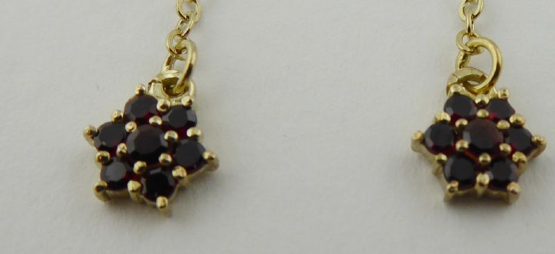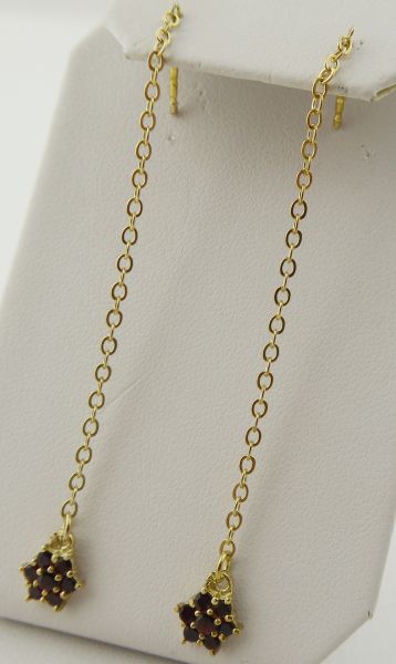 S ČESKÝMI GRANÁTY - GRANÁT, TURNOV, Česká republika, Turnov, přelom 20. a 21. století. Zlacené stříbro vysoké ryzosti, přírodní české granáty. Výrobce: Granát, Turnov - družstvo umělecké výroby. Ryzost Ag 925/1000, celková hmotnost 1,85 g. Délka náušnic 68 mm. Dlouhé visací náušnice ze zlaceného stříbra vysoké ryzosti zakončené drobnou kytičkou z pravých českých granátků. Náušnice mají zapínání na puzetu. Značeno: značkou výrobce a značkou ryzosti 925.