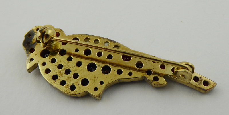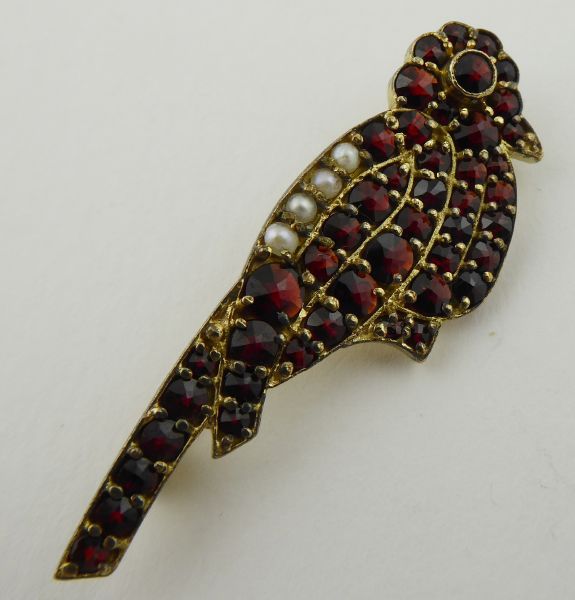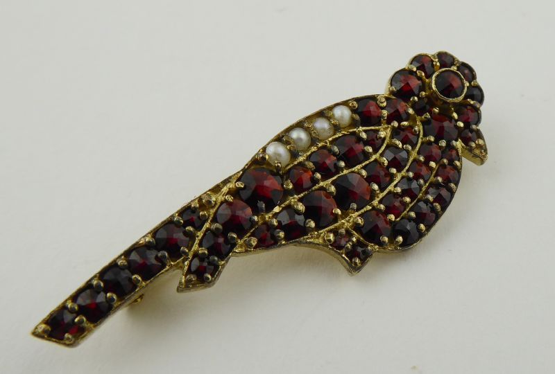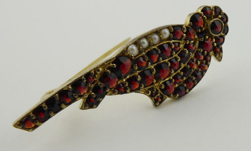 A PERLIČKAMI - PTÁČEK, Československo, od roku 1957. Zlacené stříbro, přírodní české granáty a přírodní říční perličky. Ryzost Ag 900/1000, celková hmotnost 5,95 g. Rozměr brože: 45 mm x 10 mm. Zlacená stříbrná brož v originálním podobenství ptáčka s dlouhými ocasními perutěmi zdobená malými pravými ručně broušenými českými granátky a říčními perličkami. Velmi pěkný šperk. Značeno: československý punc zajíc.