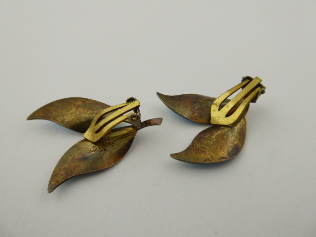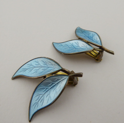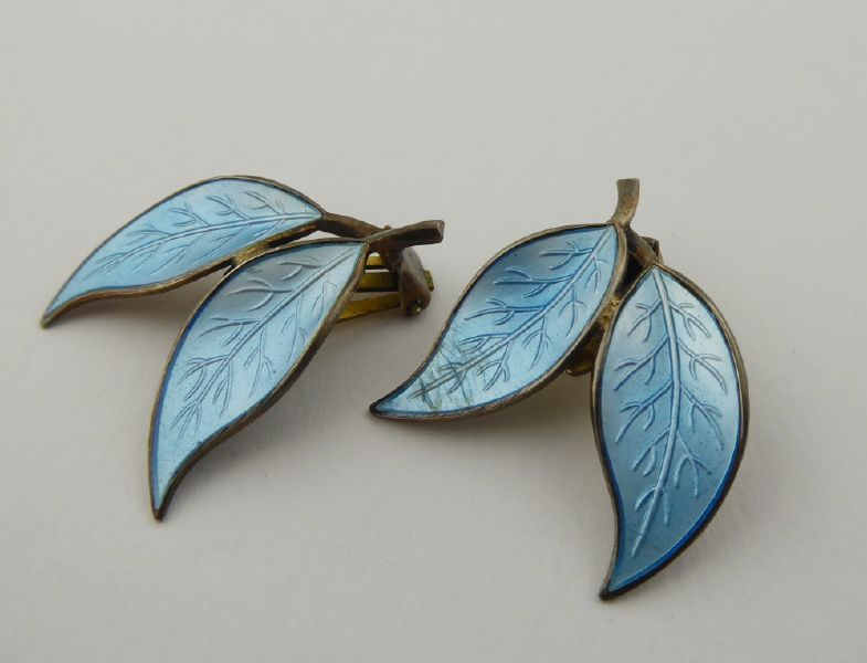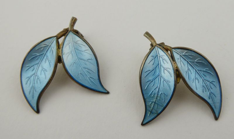 - WILLY WINNAES, Norsko, Oslo, 50. léta minulého století. Stříbro vysoké ryzosti, barevný email, klipsy (klapky) z obecného kovu. Ryzost Ag 925/1000, celková hmotnost 8,52 g. Přiloženo osvědčení Puncovního úřadu České republiky. Design: Willy Winnaes pro firmu David Andersen, Oslo. Rozměr náušnic: 35 mm x 25 mm. Náušnice ze stříbra vysoké ryzosti ve tvaru lístků ručně barvené pastelovým odstínem tyrkysové emailové barvy. Náušnice mají zapínání na klipsy z obecného kovu. Značeno: značka výrobce, mistrovská značka, značka ryzosti 925 a nápis STERLING NORWAY.