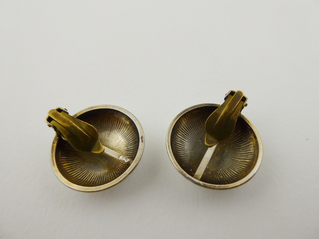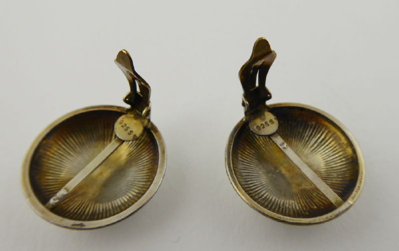 - FINN JENSEN, NORSKO, Norsko, Oslo, 60. až 70. léta minulého století. Stříbro vysoké ryzosti, barevný email, klipsy (klapky) z obecného kovu. Ryzost Ag 925/1000, celková hmotnost 8,83 g. Přiloženo osvědčení Puncovního úřadu České republiky. Design: Finn Jensen, Oslo. Průměr náušnic 25 mm. Originální designové náušnice ze stříbra vysoké ryzosti kulatého a mírně vypouklého tvaru zdobené bílým emailem a centrálními modrošedými kytičkami s listy a úponky. Náušnice mají zapínání na klipsy z obecného kovu. Značeno: mistrovská značka, značka ryzosti 925 S (jako Sterling).