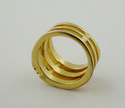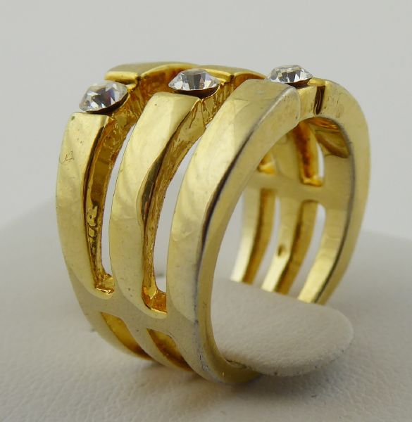 Evropa, třetí třetina minulého století. Zlacený kov, sklo. Velikost prstenu 52. Výrazný prsten ze zlaceného kovu tvořený třemi spojenými obroučkami, které zdobí skleněné broušené kamínky.