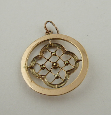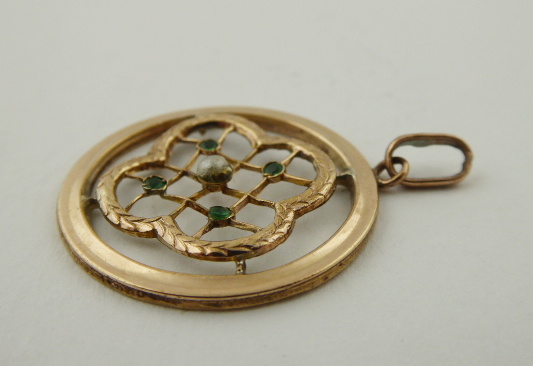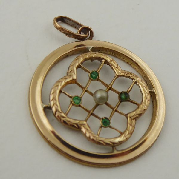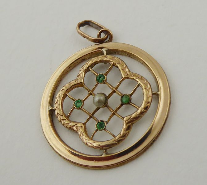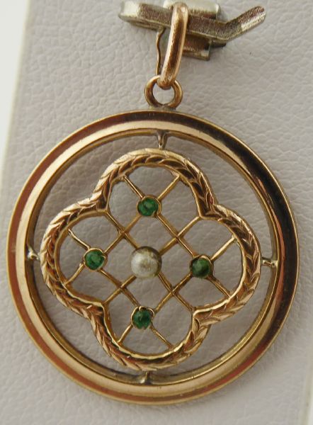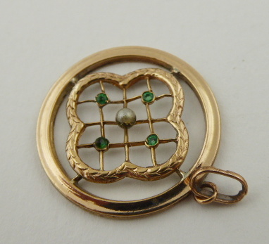 SE ZELENÝMI KAMÍNKY A PERLIČKOU, Čechy 1910 - 1940. Zlacený kov, skleněné zelené kamínky a bižuterní perlička. Průměr přívěsku 25 mm. Přívěsek ze zlaceného kovu v podobě kroužku, v němž je vsazený stylizovaný čtyřlístek s mřížkou zdobenou uprostřed bižuterní perličkou a po stranách čtyřmi zelenými skleněnými kamínky.