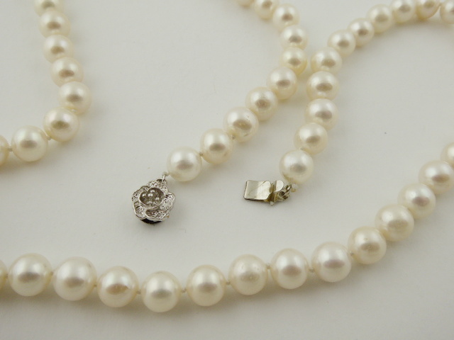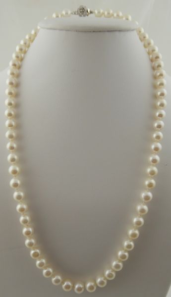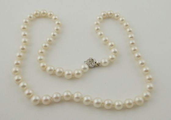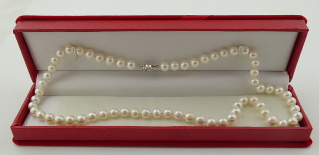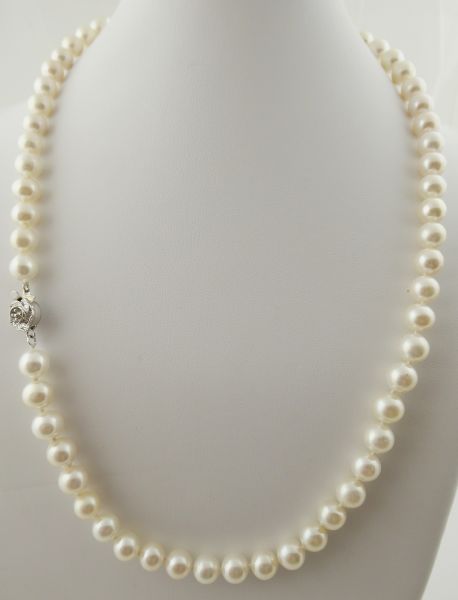 Evropa, přelom 20. a 21. století. Kultivované sladkovodní perly, bílý kov. Délka náhrdelníku 540 mm, průměr perel s nerovným povrchem 8 mm. Elegantní náhrdelník ze sladkovodních perel se zdobným uzávěrem z bílého kovu. Nošením místy odřené. V luxusní dárkové sametové etui.