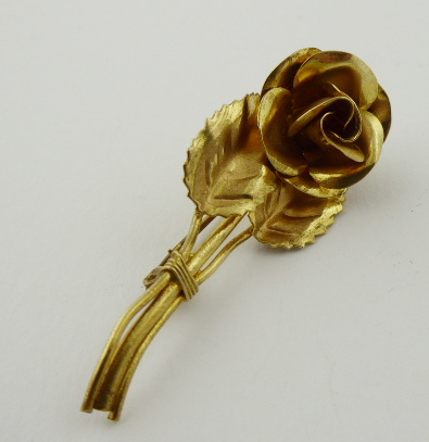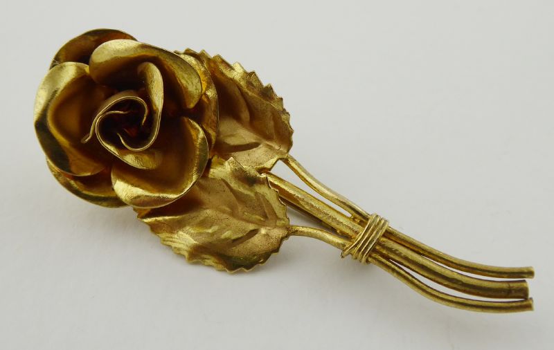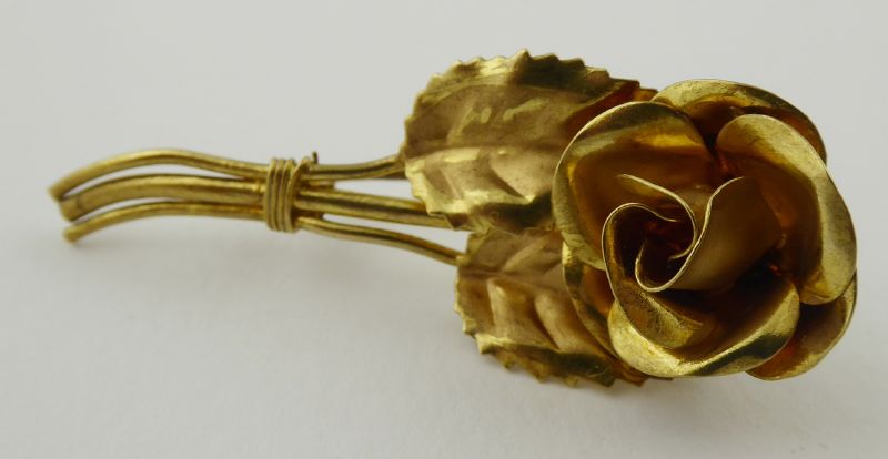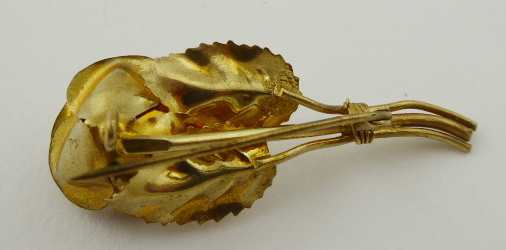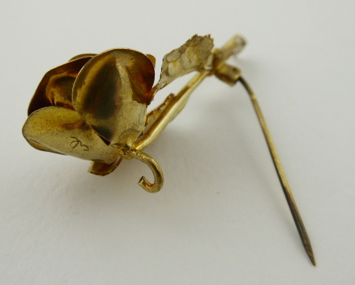 Německo 1910 - 1940. Kov. Rozměr brože: 55 mm x 23 mm. Brož stylizovaná do růže zlatavé barevnosti. 300