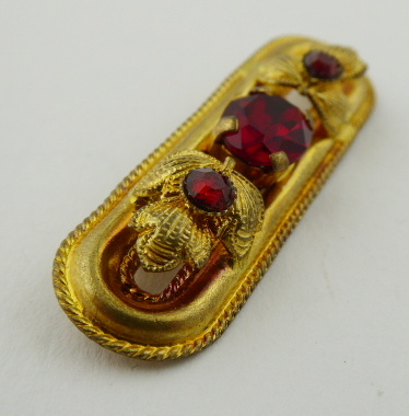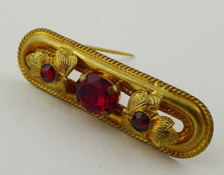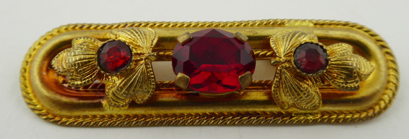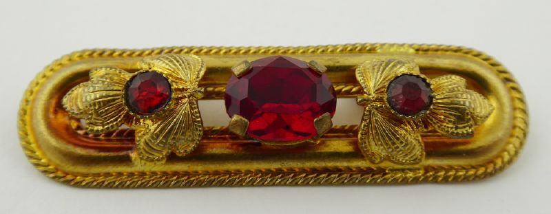 A SKLENĚNÝMI KAMÍNKY, Čechy, Jablonecko 1900 - 1940. Kov se zlatavě bronzovou patinou, syntetický broušený rubín a skleněné kamínky. Rozměr brože: 47 mm x 13 mm. Oválná brož z kovu s bronzově zlatavou patinou zdobená reliéfními květy se skleněnými středy a větším centrálním broušeným syntetickým rubínem.
