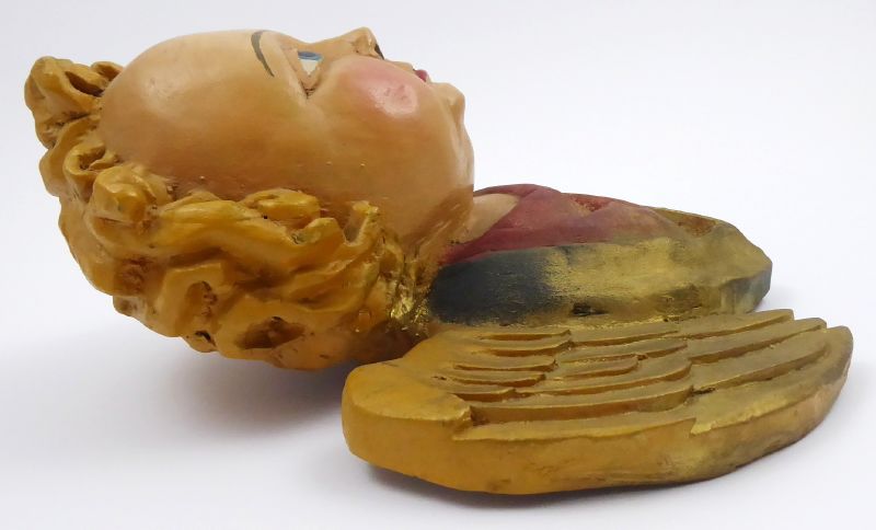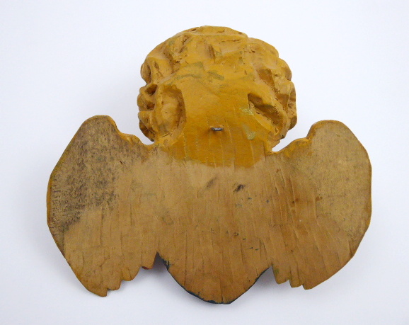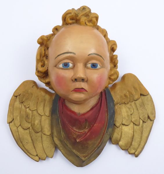 Střední Evropa, druhá polovina minulého století. Dřevo, ruční řezba, polychromie, zlacení. V renesančním stylu. Výška 25 cm. Hlava anděla s vyvýšenou světlovlasou kudrnatou čupřinou, ručně barevně malovaným obličejem a různobarevnou rouškou na hrudi. Křídla se zlacenou patinou. Hlava anděla je plně plastická, jen horní část zad plochá. Vzadu úchyt na závěs.