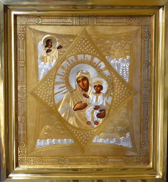 - VĚTŠÍ IKONA VE SKŘÍŇCE, Rusko 1870 - 1890. Tempera na dřevěné desce 36 cm x 31 cm, dřevo s mahagonovou dýhou, zlacená a stříbřená mosaz, sklo. Přiloženo osvědčení Národního památkového ústavu České republiky. Celkový rozměr s dřevěnou kióto (skříňkou, schránkou) 61 cm x 41 cm. Ikona s polopostavou Bohorodičky Hogedetrie - Nespalitelný keř s Ježíšem Kristem neurčitého věku usazeným na její levé ruce. Panna Maria ukazuje pravou rukou na Ježíška jako cestu ke spáse. Nespalitelný keř vychází z Mojšíšova vidění (Exodus 3), kde keř hoří, ale neshoří. V ikonomalbě to představuje čistotu Panny Marie, jež počala, aniž by ztratila panenství. Světice je zasazena do středu osmicípé hvězdy. V rozích ikony v segmentech hvězd jsou čtyři symboly evangelistů: anděl - Matouš, orel - Jan, lev - Marek a býk - Lukáš. Povrch ikony je pokryt mosazným či kovovým zlaceným a stříbřeným pláštěm. Dekorativnost podtrhují na stranách geometrické vzory a technika gilošování a gravírování. Ikona je umístěna v dřěvěném rámečku se žlutým kovovým čelním opláštěním a v kiótu - profilovaná dřevěná schránka či skříňka s cibulovitým návrším dekorovaná uvnitř prořezávanou mosaznou aplikací. Schránka je opatřena sklem.