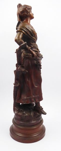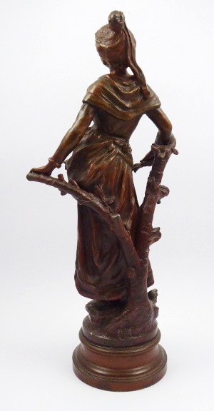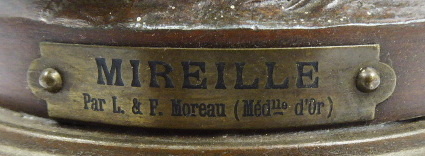 H. F. MOREAU (1857-1930), MIREILLE - VYŠŠÍ SOCHA Francie, Paříž 1880 - 1910. Zinc d´art (slitina na bázi zinku, aglicky zvaná SPELTER) s bronzovou patinou. Signatura vlevo nahoře na plintě L. F. Moreau. Mosazná tabulka uprostřed na podstavci se jménem "MIREILLE PAR" (Paříž) a jmény autorů "L. & F. MOREAU". Výška 60 cm. Autoři: Louis Auguste Moreau (1855-1919) a Hippolyte Francois Moreau (1857-1930), francouzští sochaři tvořící v Paříži. Vyšší socha z umělecké slitiny na bázi zinku s bronzovou patinou představující v romantickém stylu stojící mladou dívku opírající se o stylizované větvoví a držící v pravé ruce větvičku s listy a plody. Na vyvýšeném odstupňovaném podstavci kulatého tvaru.