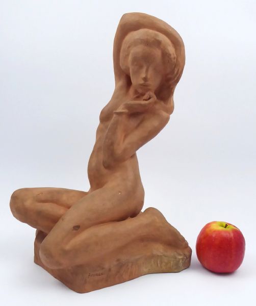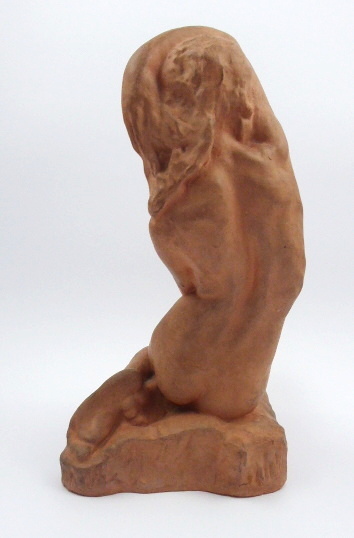 Terakota. Terakotová soška figury nahé dívky sedící na stylizovaném úzkém...