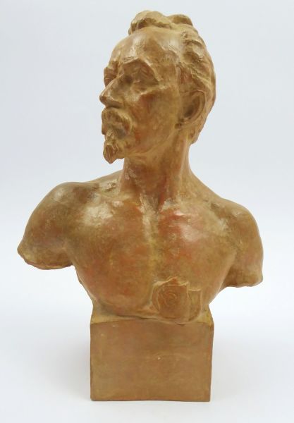 BUSTA ZAKLADATELE SOKOLA MIROSLAVA TYRŠE Československo 1920 - 1930. Terakota. Nesignováno. Na plintě vpředu jméno Tyrše. Dole na levém prsu plastiky sokolský znak. Autor bysty v bronzu: Josef Václav Pekárek (1878-1930). Výška 25 cm. Terakotová bysta zakladatele Sokola a národního obrozence Miroslava Tyrše (1832-1884).