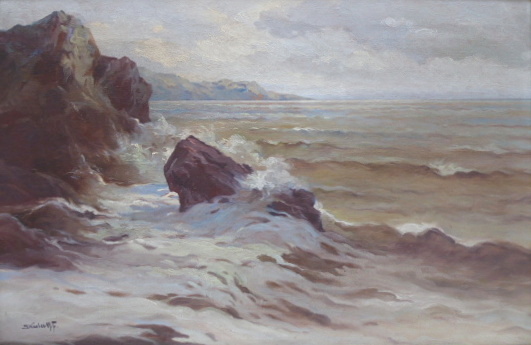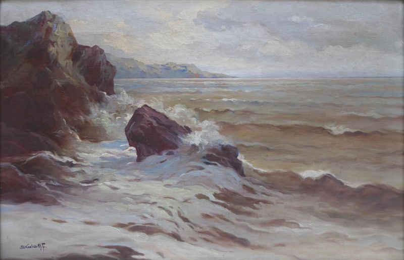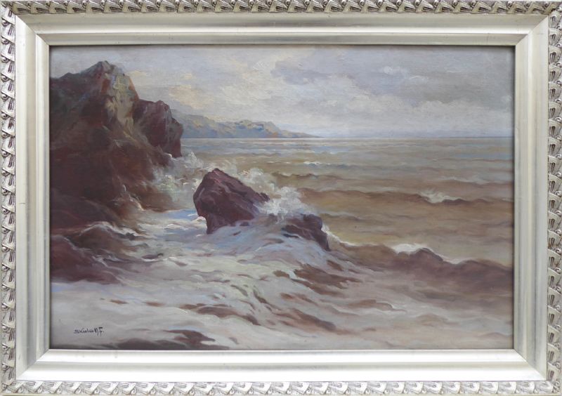 MOŘSKÉ VLNY U SKALNATÉHO POBŘEŽÍ, Jižní Evropa 1920 - 1938. Olej na plátně 39 cm x 59,5 cm. Signováno vlevo dole. Autor: Matěj František Skula (1891-1977). Celkový rozměr s rámem 47 cm x 67 cm. Mořská scenérie s vlnobitím a skalisky. Ve stříbrném rámu se secesním ornamentem.