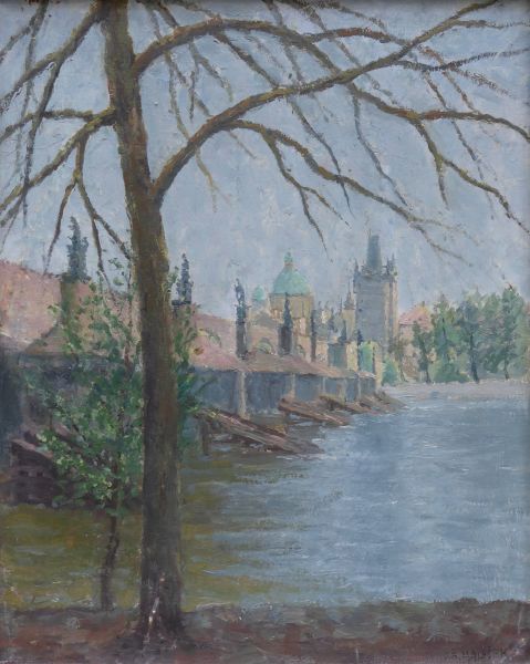 KARLŮV MOST, Československo 1890 - 1983. Olej na plátně 50 cm x 40 cm. Autor: Josef Štefan Maleček (1890-1983). Signováno vpravo dole. Vzadu originální papírový štítek s popisem obrazu a razítkem ČFVK (Český fond výtvarných umělců). Celkový rozměr s rámem 64 cm x 54 cm. Pohled na Karlův most od vody. V originálním světlém profilovaném rámu.