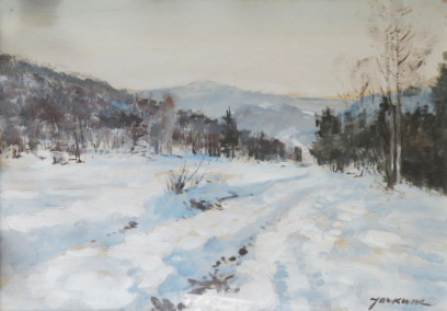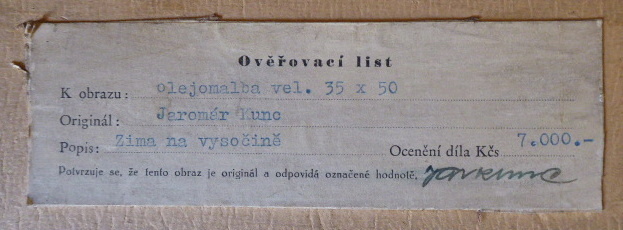 ZIMA NA VYSOČINĚ, Československo 1940 - 1950. Olej na kartonu 35 cm x 50 cm. Signováno vpravo dole. Vzadu ověřovací list s vlastnoručním podpisem malíře. Vzadu v dolní části originální papírový štítek s údaji o malíři z roku 1950. Autor: Jaromír Kunc (1900-1971). Celkový rozměr s rámem 50 cm x 65 cm. Atmosféra zimy se zasněženými pláněmi a kopečky Vysočiny. Ve stříbřitém rámu s řezanými ornamenty v rozích. Malba chráněna sklem.