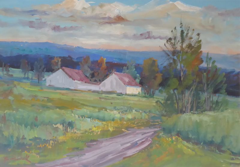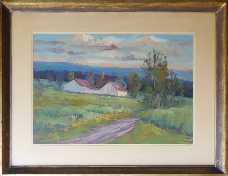 Z ČESKOMORAVSKÉ VRCHOVINY, Československo 1940 - 1960. Olejová tempera na kartonu 33 cm x 48 cm. Signováno vpravo dole. Autor: Karel Balíček (1904-1985). Celkový rozměr s rámem 51,5 cm x 66,5 cm. Poklidná atmosféra uprostřed zvlněné krajiny Českomoravské vrchoviny se stavením na samotě. V rámu s paspartou a sklem.