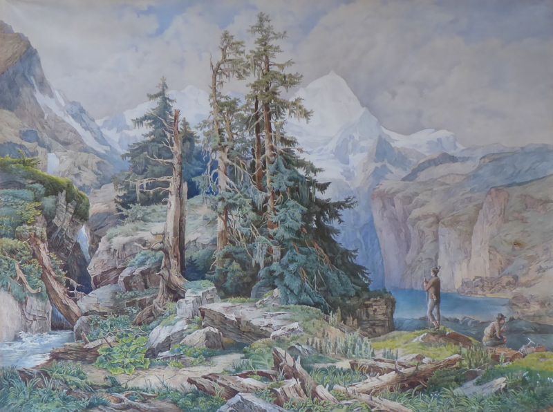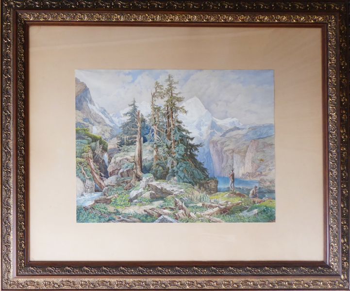 PŘED VÝSTUPEM NA WIESBACHHORN - ROZMĚRNÝ OBRAZ Rakousko, Salzburg a okolí 1850 - 1893. Akvarel na papíru 46,3 cm x 62,3 cm. Signováno vpravo dole. Možný autor: Gustav Richard Steinbrecher (1828-1887). Celkový rozměr s rámem 88,5 cm x 109,5 cm. Romanticky zachycená idylická krajina s dvěma vysokohorskými turisty odpočívajícími na skalním výběžku před výstupem na Wiesbachhorn. Ve velmi pěkném hnědém odstupňovaném rámu se zlatými reliéfními ornamenty, s paspartou a sklem. Rozměrný obraz.