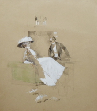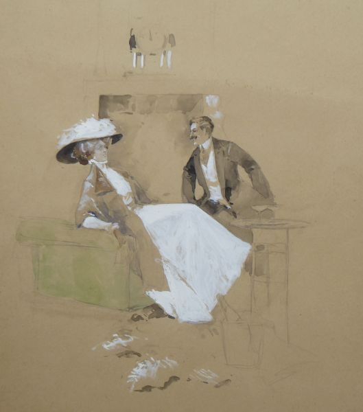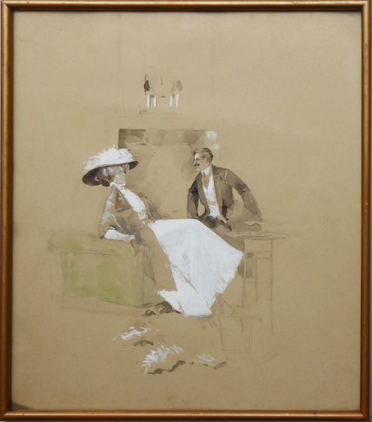 Čechy 1890 - 1920. Kvaš, akvarel, tuš a tužka na papíru 32 cm x 29 cm. Nesignováno. Stylem připomínající ilustrace slavného malíře a ilustrátora Luďka Marolda. Celkový rozměr s rámem 34 cm x 31 cm. Dáma a kavalír v důvěrném rozhovoru nad sklenkou šampaňského. Originální zlatý rám se sklem.