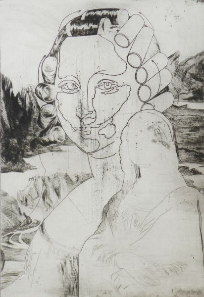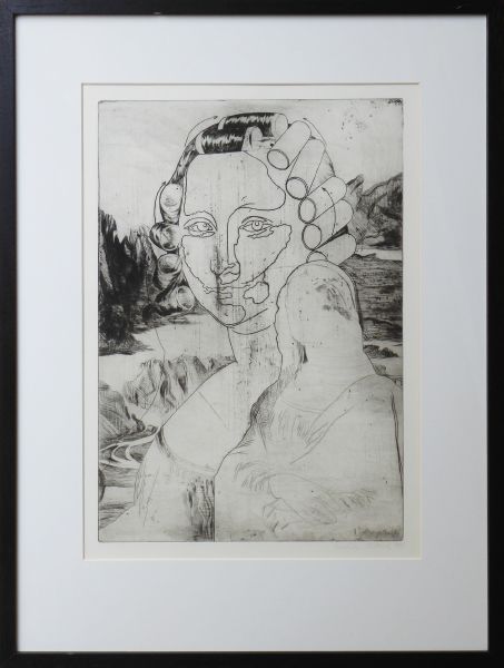 MONA LISA, Československo, rok 1968. Suchá jehla na papíru 43 cm x 30 cm. Signováno vpravo dole tužkou s datací 1968. Autor: Naděžda Plíšková (1934-1999). Autorčina variace nejslavnějšího portrétu "Mona Lisa" (La Gioconda) - Leonardo da Vinci (1452-1519). Nový stylový černý rám s paspartou a sklem 65,5 cm x 49,5 cm.