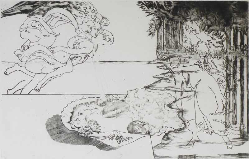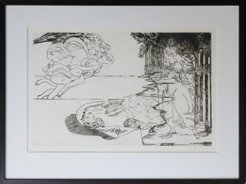 ZROZENÍ VENUŠE Československo, rok 1968. Suchá jehla na papíru 32 cm x 50 cm. Signováno vpravo dole tužkou s datací 1968. Autor: Naděžda Plíšková (1934-1999). Autorčina variace na světoznámý renesanční obraz "Zrození Venuše" - Sandro Botticelli (1445-1510). Nový stylový černý rám s paspartou a sklem 52,5 cm x 69 cm.
