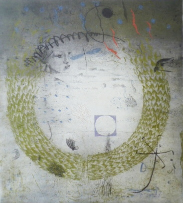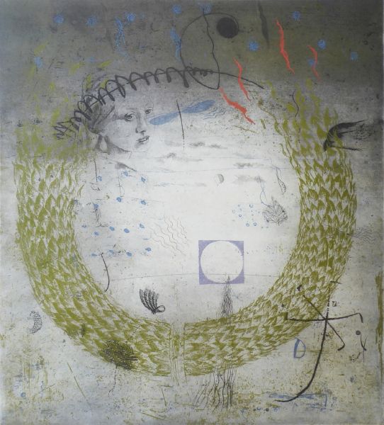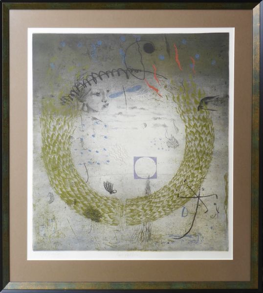 KOMPOZICE - VĚTŠÍ ROZMĚR Československo, třetí třetina minulého století. Kombinovaná technika, barevný lept na papíru 53 cm x 48 cm. Signováno tužkou dole uprostřed. Vlevo dole tužkou ručně psané: Vytiskl autor. Autor: Pavel Sukdolák (1925-2022). Ve stylovém rámu s paspartou a sklem 71,5 cm x 63,5 cm.