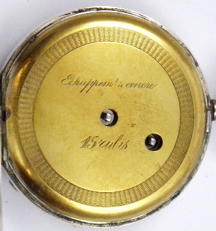 Švýcarsko 1870 - 1890. Stříbro. Ryzost Ag 800/1000, celková hmotnost 73,35 g. Přiloženo osvědčení Puncovního úřadu České republiky. Průměr hodinek 47 mm. Dvouplášťové stříbrné klíčové kapesní hodinky s vnitřním pláštěm ze žlutého kovu s gravírovaným nápisem: Echappem´t a Ancre 15 rubis. Klíček s řetízkem z obecného kovu. Bílý emailový ciferník s ručně černě malovanými římskými číslicemi, modřené ocelové Breguetovy hodinové ručičky a vteřinovka. Funkční. Vzhledem ke stáří hodinek bez záruky přesnosti chodu a dlouhodobé funkčnosti.