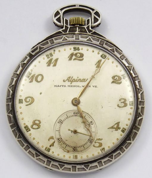 ALPINA - MATTHIAS MEINDL, WIEN, Rakousko, Vídeň 1910 - 1930. Stříbro. Ryzost Ag 900/1000, celková hmotnost 52.93 g. Průměr 50 mm. Dvouplášťové stříbrné kapesní hodinky. Plášť číslovaný se značkou výrobce Alpina, ryzost 900, švýcarský a německý punc. Hodinový stroj zn. Alpina, číslo 325. Stříbřitý ciferník s reliéfními číslicemi, zlatými ručičkami a vteřinovkou. Ciferník značený Alpina a jménem prodejce MATTH. MEINDL, WIEN VII. Funkční. Vzhledem ke stáří hodinek bez záruky přesnosti chodu a dlouhodobé funkčnosti.