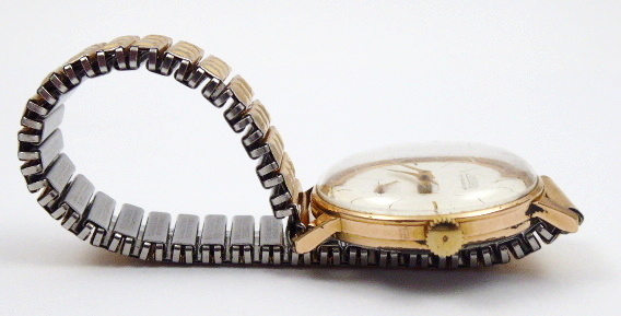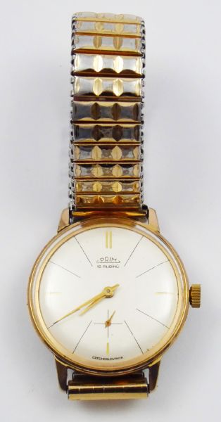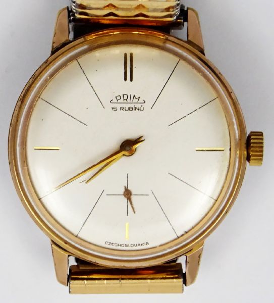 ZLACENÉ POUZDRO Z FRANCIE, Československo, rok vzniku 1964. Zlacené pouzdro, obecný kov - náramek. Náramkové hodiny značky PRIM. Typové označení: 500953. Zlacené pouzdro z Francie, průměr pouzdra 33,7 mm. Šroubovací víko. Číslované 1153139. Kovový náramek. Funkční. Vzhledem ke stáří hodinek bez záruky přesnosti chodu a dlouhodobé funkčnosti.