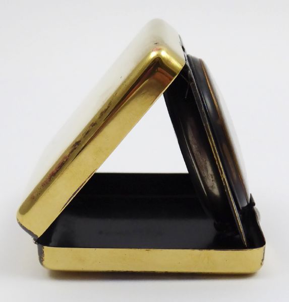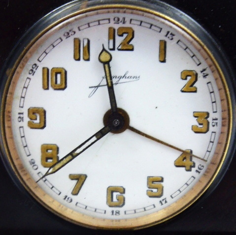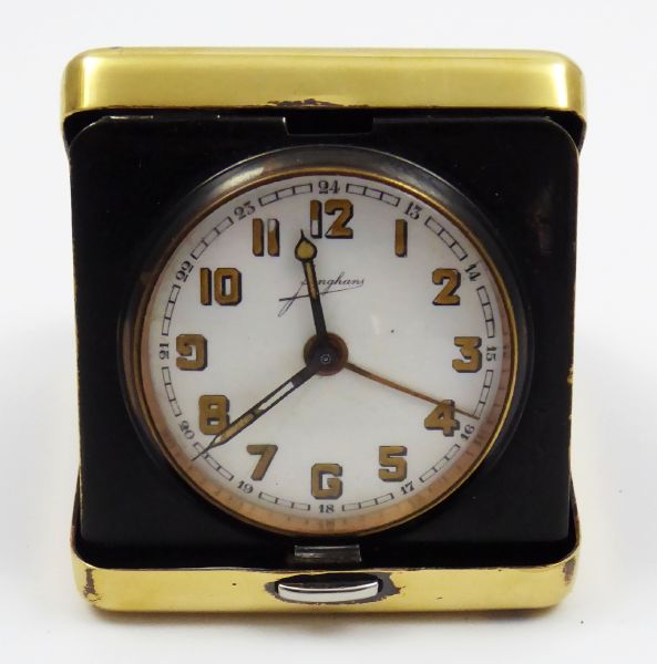 - JUNGHANS, Německo 1920 - 1940. Mosaz, černě lakovaný kov. Rozměr ve složeném stavu: 6 cm x 6 cm. Cestovní hodiny vložené do čtvercového pouzdra. Světlý emailový ciferník. Fluorescenční číslice a části hodinových ručiček. Ciferník značený Junghans. Zajímavý sběratelský kousek. Funkční. Vzhledem ke stáří hodin bez záruky přesnosti chodu a dlouhodobé funkčnosti.