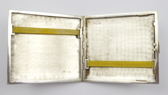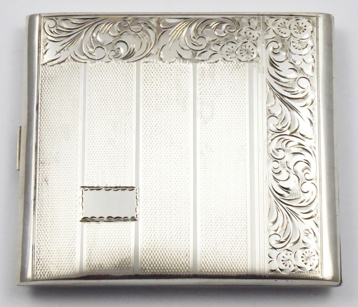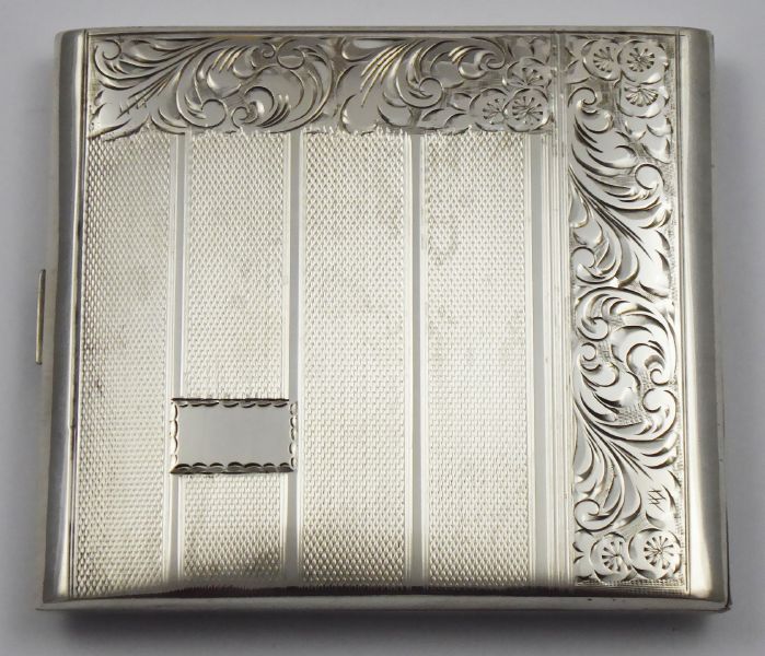 Protektorát Čechy a Morava, Československo 1941 - 1949. Stříbro. Ryzost Ag 900/1000, celková hmotnost 128,30 g. Rozměr: 9 cm x 8 cm. Stříbrná tabatěrka zdobená gravírovaným ornamentem a gilošováním. Značeno: punc šachovnice, znaménko ryzosti 900 a mistrovská značka.