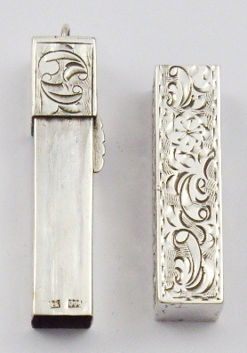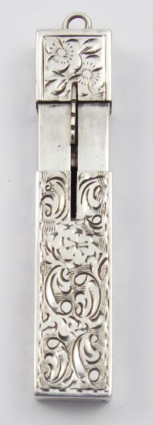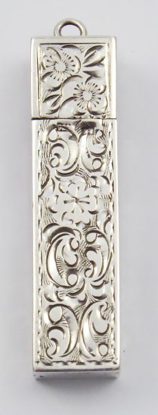 Československo 1929 - 1949. Stříbro. Ryzost Ag 900/1000, celková hmotnost 16,45 g. Délka 5 cm. Stříbrné gravírované pouzdro na rtěnku. Na horní části malé očko. Značeno: československý punc trojvrší s křížem, mistrovská značka a znaménko ryzosti 900.