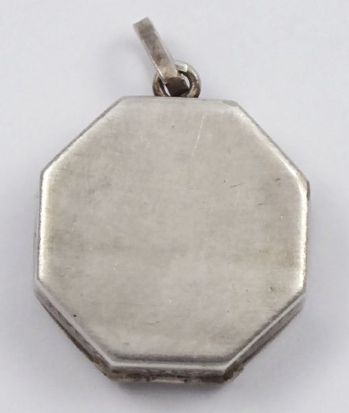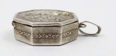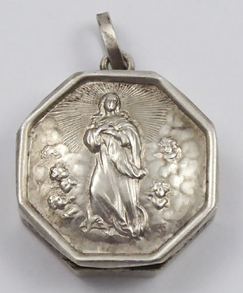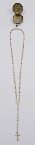 SE SCHRÁNKOU S PANNOU MARIÍ, Evropa, druhá polovina minulého století. Stříbro, obecný kov. Průměr schránky 2,2 cm, délka růžence s přívěskem 23,5 cm. Zdobná schránka osmiúhelníkové tvaru z obecného kovu s očkem na závěs. Na čelní straně s reliéfním výjevem postavy Panny Marie stojící na srpku měsíce s andílky v oblacích. Růženec ze stříbra s malým gilošovaným srdíčkem a zakončený křížkem s jemným reliéfním ornamentem. Neznačeno.