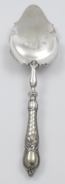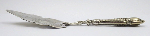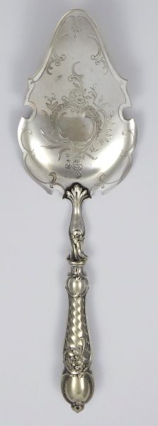 - ALBERT KÖHLER, VÍDEŇ, Rakousko-Uhersko, Vídeň 1880 - 1914. Postříbřený kov (alpaka). Celková hmotnost 128,70 g. Firma Albert Köhler & Cie, Wien (filiálka WMF). Délka 30 cm. Stříbřená lopatka na dorty, dezerty a jiné pochutiny bohatě zdobená gravírováním a reliéfně tvarovaným okrajem i rukojetí. Značeno: K & Co.