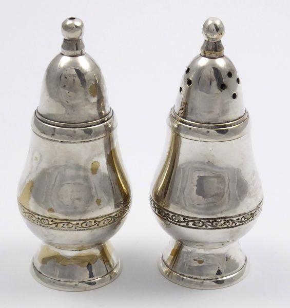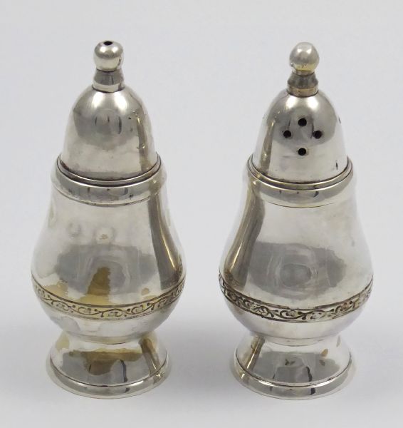 Evropa, minulé století. Stříbřená mosaz. Celková hmotnost 324,4 g. Výška obou nádobek 11 cm. Dvě masivnější elegantní stolní nádobky ze stříbřené mosazi s vnitřní vložkou z umělé hmoty. Nádobky s kulatou patkou zdobí vkusný dekorativní leptaný pás. Neznačeno.