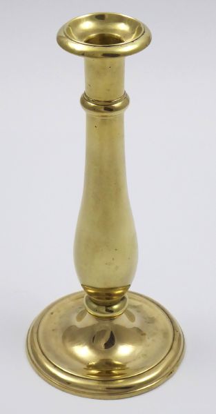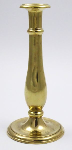 Střední Evropa 1860 - 1890. Leštěná mosaz. Výška 24,5 cm. Mosazný svícen ve tvaru kuželky s kalichovitým úchytem na svíčku.