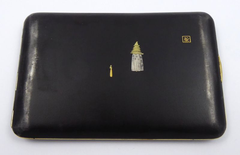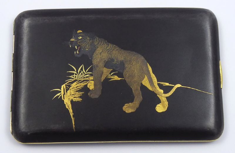 - PERIODA MEIJI (MEIDŽI), KOMAI, Japonsko, Kjóto, perioda Meiji (Meidži) 1868 - 1912. Kov, technika tausování s 24 karátovým zlatem a stříbrem. Rozměr: 12 cm x 8 cm. Exkluzivní japonské cigaretové pouzdro vyrobené damascénskou technikou z období Meiji (Meidži) z let 1868 - 1912. Damascénská technika zdobení kovů je starobylá technologie orientálního původu. Spočívá mimo jiné v technologii povrchové úpravy kovu zlatým nebo stříbrným dekorem. Výrobce: Otojiro Komai (1842-1917) založil koncem 19. století rodinnou dílnu v Kjóto a proslavil se tímto výjimečným řemeslným mistrovstvím, které získalo mezinárodní uznání. Tato tabatěrka představuje vrchol umělecké kovovýroby. Horní část pouzdra zdobí tradiční japonský motiv tygra kráčejícího krajinou vytvořený pomocí tausování s použitím 24k zlata a stříbra. Odkaz rodu Komai zahrnuje generace mistrů řemeslníků, jež postupně zdokonalovali damascénskou techniku zdobení k vytvoření mistrovských předmětů. Zajímavý sběratelský kousek. Značeno: firemní značka.