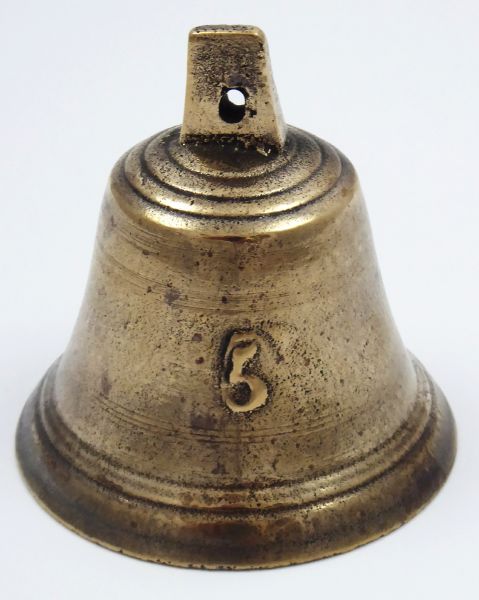 Střední Evropa 1880 - 1930. Bronz. Výška 8,5 cm. Bronzový zvonek s reliéfním číslem 5 a úchytem s otvorem na možné zavěšení.