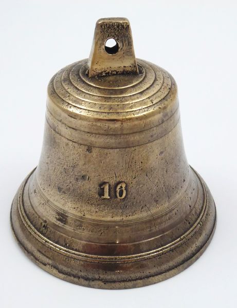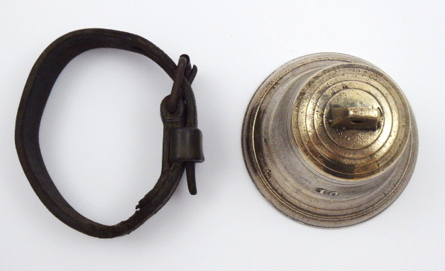 ČÍSLO 16 S KOŽENÝM ÚCHYTEM, Střední Evropa 1880 - 1930. Bronz, kůže. Výška 11,5 cm. Bronzový zvonec s reliéfním číslem 16. Na úchytu otvor na závěs. Ke zvonci je přiložen i kožený řemen, opasek na případné dekorativní zavěšení.
