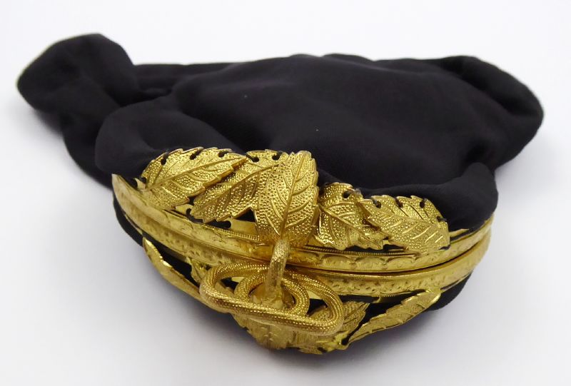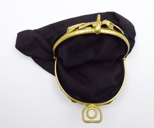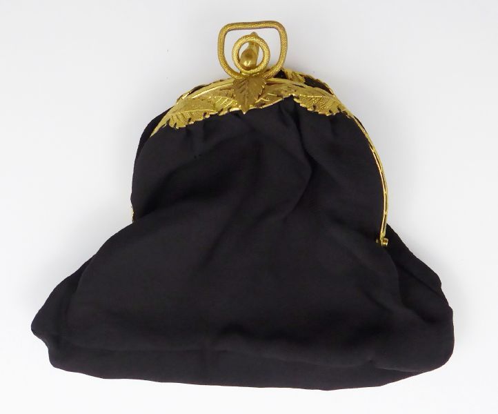 S APLIKACÍ ZE ŽLUTÉHO KOVU, Střední Evropa, druhá polovina minulého století. Černá látka, žlutý kov. Šířka 17 cm, výška 15 cm. Malá plesová látková kabelka do ruky se zdobnou aplikací v podobě různě složených lístků a miniaturních reliéfních ornamentů ze žlutého kovu, jíž korunuje uzávěr v podobě stylizovaného uzlíku.
